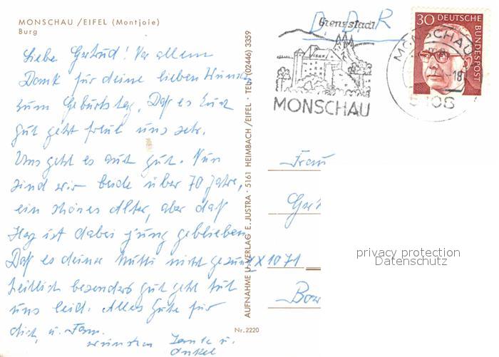 72910907 alte Postkarte Monschau Montjoie NRW Altstadt Burg postalisch gelaufen Erhaltung siehe scans [FriedD77] KatCode: 11110005354020