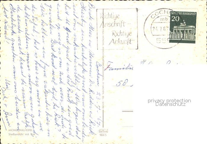 72304195 alte Postkarte Monschau Montjoie NRW Altstadt mit Rur postalisch gelaufen Erhaltung siehe scans KatCode: 11110005354020