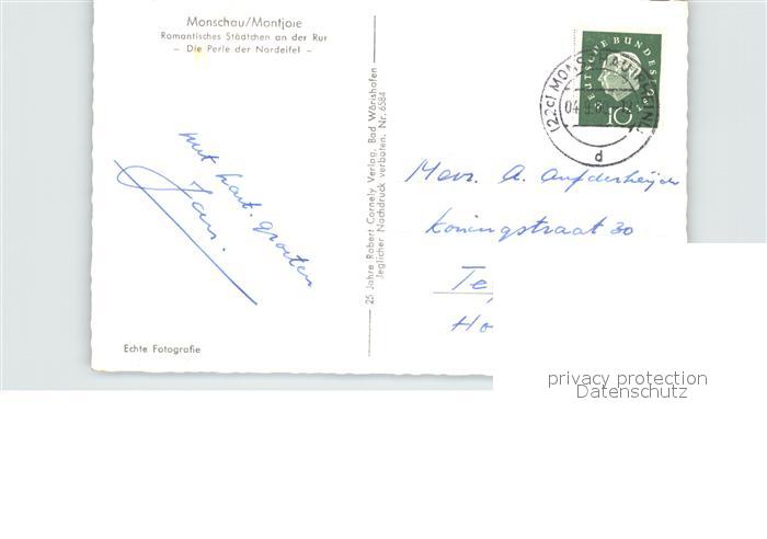 72526740 alte Postkarte Monschau Montjoie NRW Auf den Planken Rur postalisch gelaufen Erhaltung siehe scans KatCode: 11110005354020