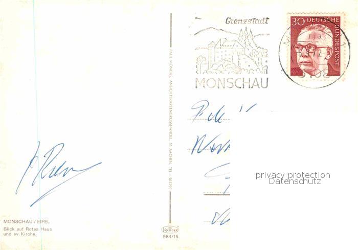 72858869 alte Postkarte Monschau Montjoie NRW Blick auf Rotes Haus und evangelische Kirche postalisch gelaufen Erhaltung siehe scans [FriedD77] KatCode: 11110005354020