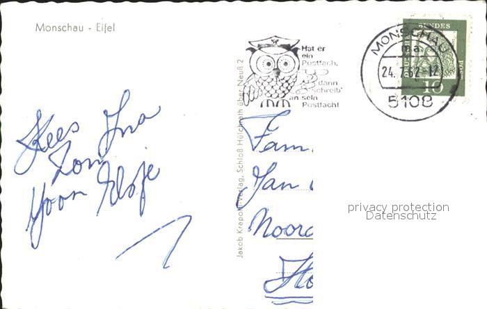 72074761 alte Postkarte Monschau Montjoie NRW Blick ueber die Altstadt Kirche Burg postalisch gelaufen KatCode: 11110005354020