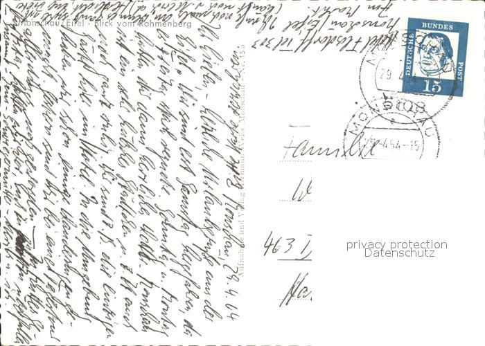 71913117 alte Postkarte Monschau Montjoie NRW Blick vom Rahmenberg postalisch gelaufen Erhaltung siehe scans KatCode: 11110005354020