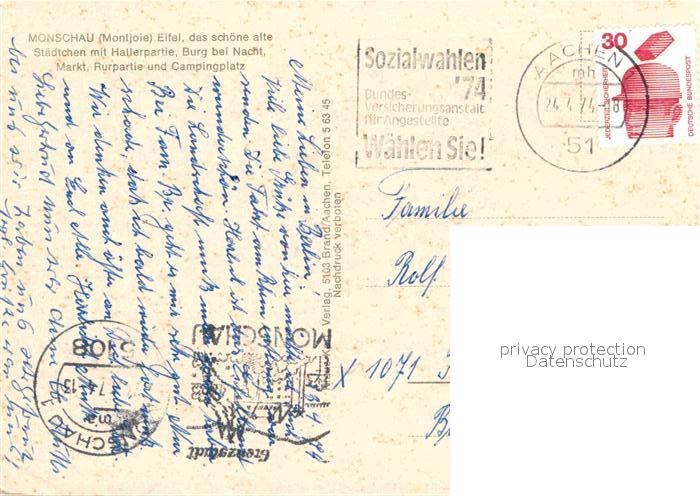 72917140 alte Postkarte Monschau Montjoie NRW Burg Markt Campingplatz postalisch gelaufen Erhaltung siehe scans [NatalD47] KatCode: 11110005354020