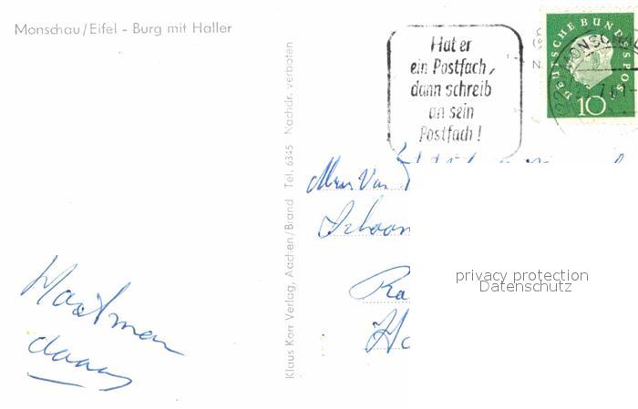 72762830 alte Postkarte Monschau Montjoie NRW Burg mit Haller postalisch gelaufen Erhaltung siehe scans [AndreD76] KatCode: 11110005354020