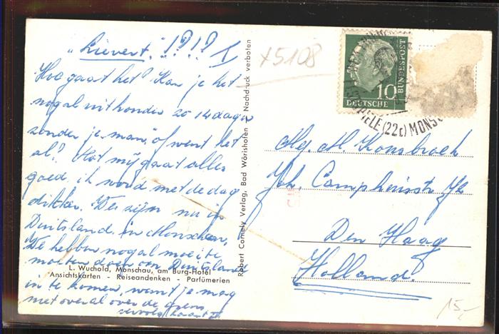 41493476 Monschau Montjoie NRW Burg und Alte Kirche postalisch gelaufen Erhaltung siehe scans Alte Ansichtskarte Postkarte alte Postkarte hz_W Katcode 11110005354020