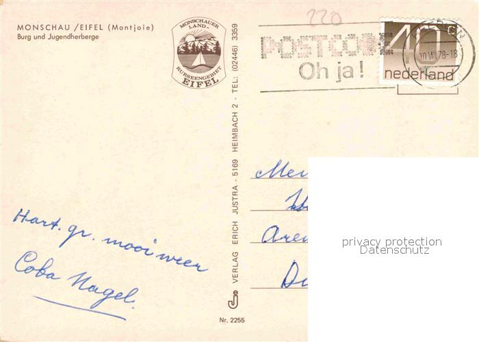 72855819 alte Postkarte Monschau Montjoie NRW Burg und Jugendherberge postalisch gelaufen Erhaltung siehe scans [FriedD77] KatCode: 11110005354020