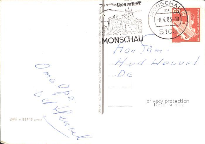 72462115 alte Postkarte Monschau Montjoie NRW Burgau Jugendherberge Kurbruecke Rotes Haus Eschbachstrasse postalisch gelaufen Erhaltung siehe scans KatCode: 11110005354020