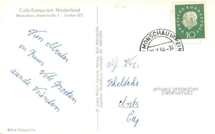 33658376 Monschau Montjoie NRW Cafe Restaurant Niederland Gastraum Panorama postalisch gelaufen Erhaltung siehe scans [WerneD78] alte Postkarte Wern Katcode 11110005354020