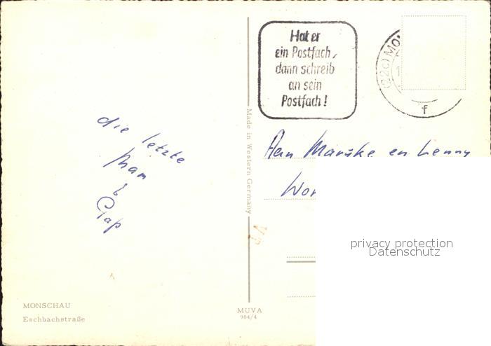 72451817 alte Postkarte Monschau Montjoie NRW Eschbachstrasse Fachwerkhaeuser am Fluss Altstadt postalisch gelaufen Erhaltung siehe scans KatCode: 11110005354020