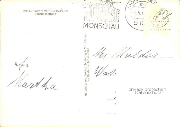72254236 alte Postkarte Monschau Montjoie NRW Eschbachstrasse Luftkurort postalisch gelaufen Erhaltung siehe scans KatCode: 11110005354020