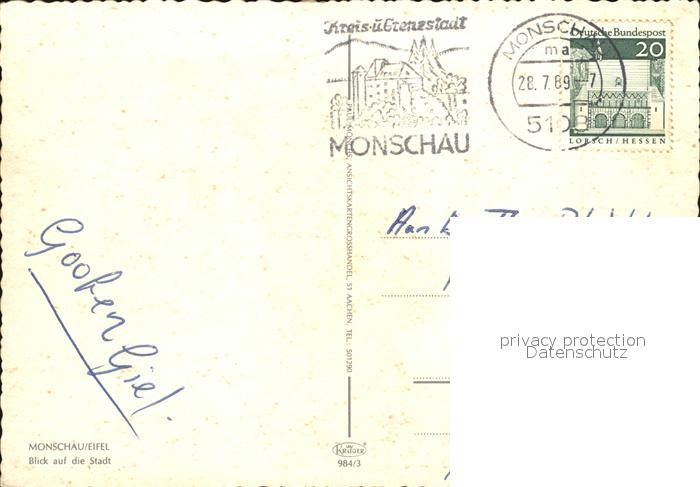 72605711 alte Postkarte Monschau Montjoie NRW Fliegeraufnahme postalisch gelaufen Erhaltung siehe scans [AndreD76] KatCode: 11110005354020