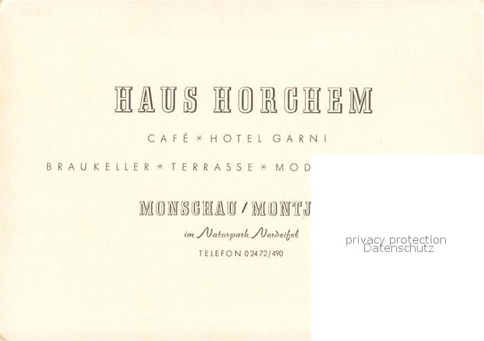 73718211 Monschau Montjoie NRW Haus Horchem Cafe Hotel Garni Burgruine postalisch nicht gelaufen Werbekarte (keine Postkarte) Erhaltung siehe scans [WerneD78] Werbekarte (keine Postkarte) Wern Katcode 11110005354020