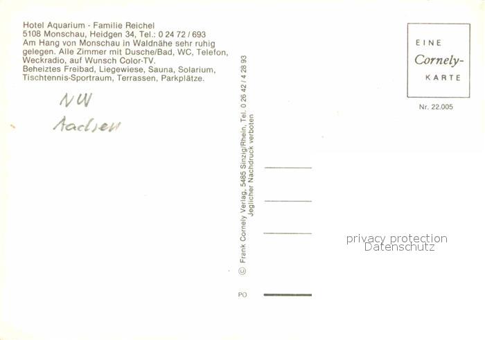 72919212 Monschau Montjoie NRW Hotel Aquarium postalisch nicht gelaufen Erhaltung siehe scans [NatalD47] KatCode: 11110005354020