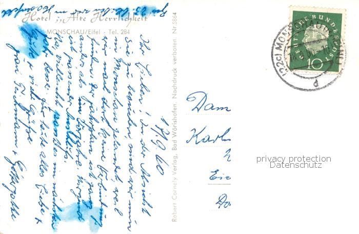 73833963 Monschau Montjoie NRW Hotel Cafe Alte Herrlichkeit postalisch gelaufen Erhaltung siehe scans [WerneD78] alte Postkarte Wern Katcode 11110005354020