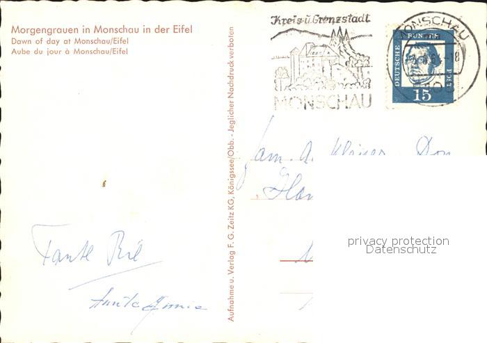 72504259 alte Postkarte Monschau Montjoie NRW Im Morgengrauen postalisch gelaufen Erhaltung siehe scans KatCode: 11110005354020