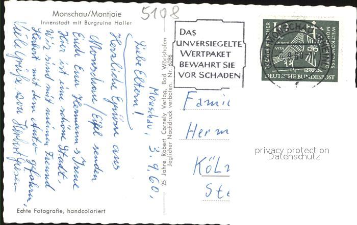 72447225 alte Postkarte Monschau Montjoie NRW Innenstadt mit Burgruine Haller postalisch gelaufen Erhaltung siehe scans KatCode: 11110005354020