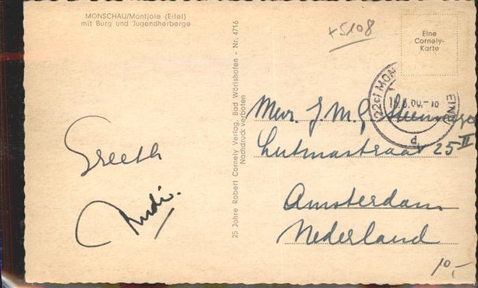 41493588 Monschau Montjoie NRW mit Burg und Jugendherberge postalisch gelaufen Erhaltung siehe scans Alte Ansichtskarte Postkarte alte Postkarte hz_W Katcode 11110005354020