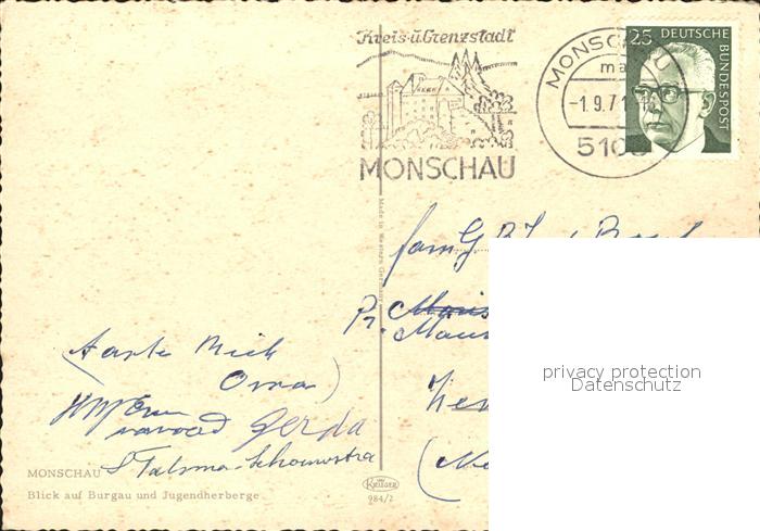 72255353 alte Postkarte Monschau Montjoie NRW mit Burgau und Jugendherberge postalisch gelaufen Erhaltung siehe scans KatCode: 11110005354020