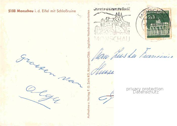 72886187 alte Postkarte Monschau Montjoie NRW mit Schlossruine postalisch gelaufen Erhaltung siehe scans [LiesaD40] KatCode: 11110005354020