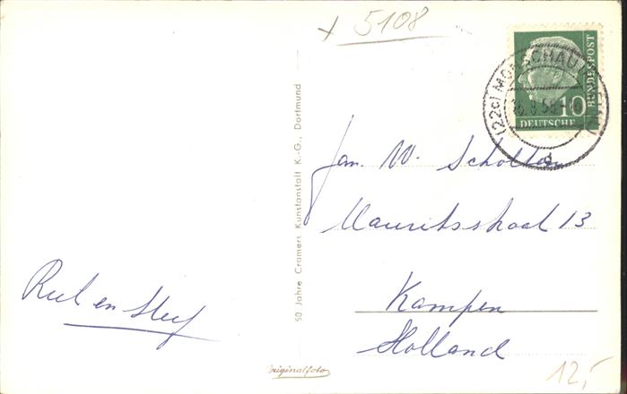 41493592 Monschau Montjoie NRW Neue Rurbruecke Ev Kirche und Halle postalisch gelaufen Erhaltung siehe scans Alte Ansichtskarte Postkarte alte Postkarte hz_W Katcode 11110005354020