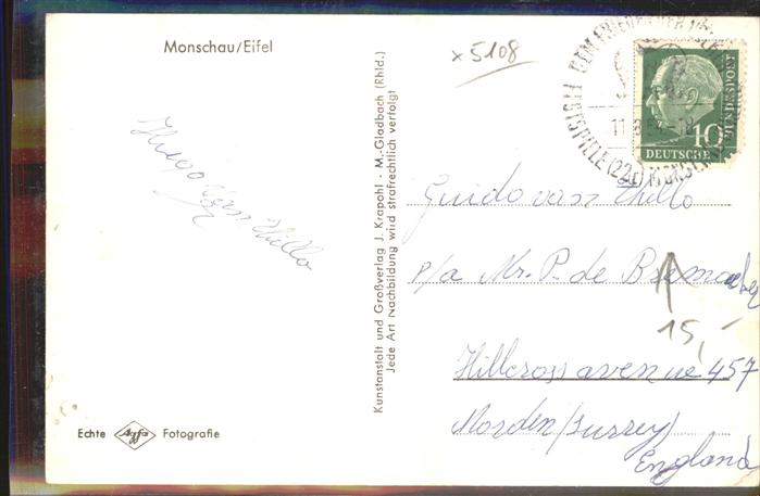 41493467 Monschau Montjoie NRW Ortsansicht postalisch gelaufen Erhaltung siehe scans Alte Ansichtskarte Postkarte alte Postkarte hz_W Katcode 11110005354020