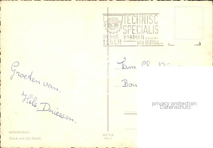 72442869 alte Postkarte Monschau Montjoie NRW Panorama postalisch gelaufen Erhaltung siehe scans KatCode: 11110005354020