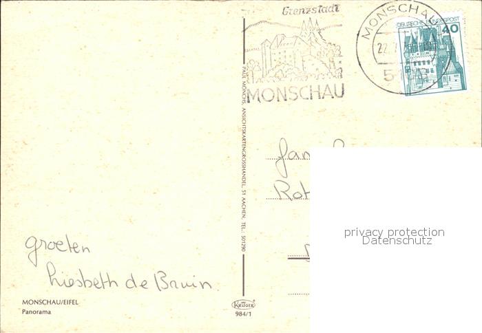 72454349 alte Postkarte Monschau Montjoie NRW Panorama Altstadt postalisch gelaufen Erhaltung siehe scans KatCode: 11110005354020