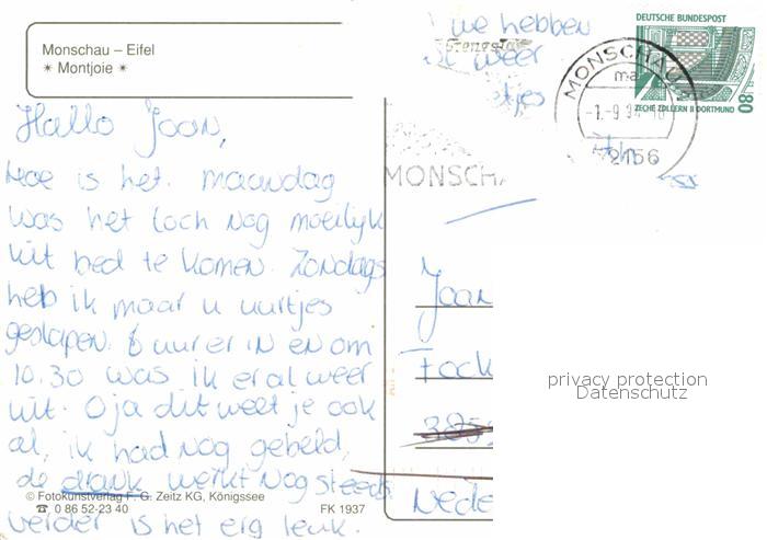 72787360 alte Postkarte Monschau Montjoie NRW Panorama Rotes Haus Ruine Haller Rurpartie postalisch gelaufen Erhaltung siehe scans [WerneD78] KatCode: 11110005354020