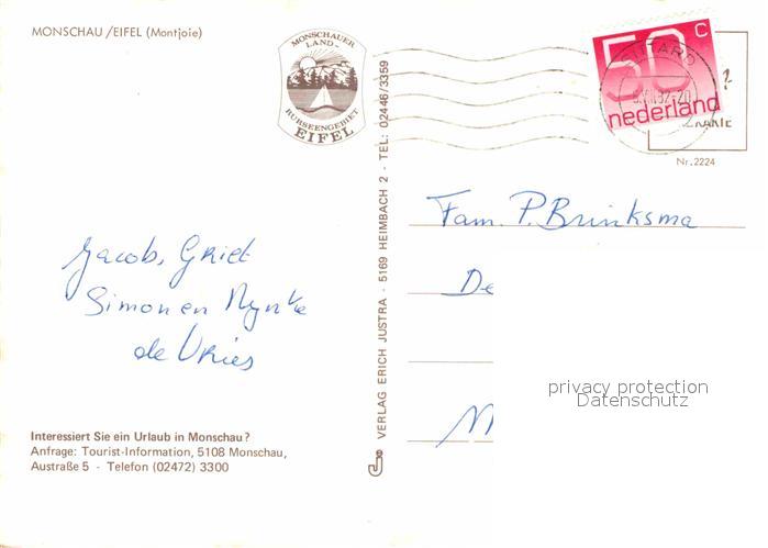 72661239 alte Postkarte Monschau Montjoie NRW Panorama Rotes Haus postalisch gelaufen Erhaltung siehe scans [WerneD78] KatCode: 11110005354020