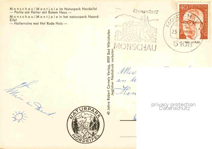 72860058 alte Postkarte Monschau Montjoie NRW Partie am Haller mit Rotem Haus Burgruine Altstadt Fachwerkhaeuser postalisch gelaufen Erhaltung siehe scans [FriedD77] KatCode: 11110005354020