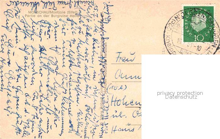 72743202 alte Postkarte Monschau Montjoie NRW Partie an der Burgruine Haller Altstadt Fachwerkhaeuser postalisch gelaufen Erhaltung siehe scans [FriedD77] KatCode: 11110005354020
