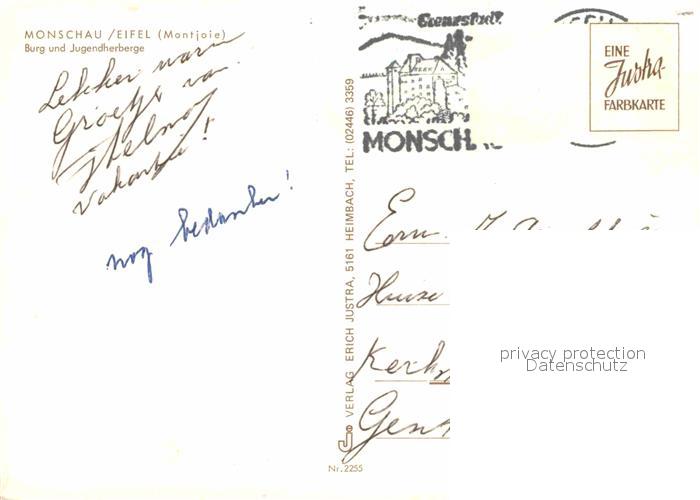 72914958 alte Postkarte Monschau Montjoie NRW Partie an der Rur Blick zur Burg Jugendherberge postalisch gelaufen Erhaltung siehe scans [FriedD77] KatCode: 11110005354020