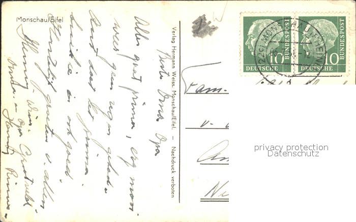 72093535 alte Postkarte Monschau Montjoie NRW Partie an der Rur Kirchstrasse Rosental Hallerpartie postalisch gelaufen Erhaltung siehe scans KatCode: 11110005354020