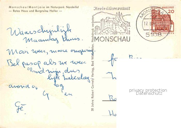 72924971 alte Postkarte Monschau Montjoie NRW Rotes Haus Burgruine Haller postalisch gelaufen Erhaltung siehe scans [NatalD47] KatCode: 11110005354020