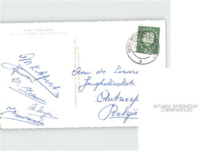 72329229 alte Postkarte Monschau Montjoie NRW Rotes Haus mit Ruine Haller postalisch gelaufen Erhaltung siehe scans KatCode: 11110005354020