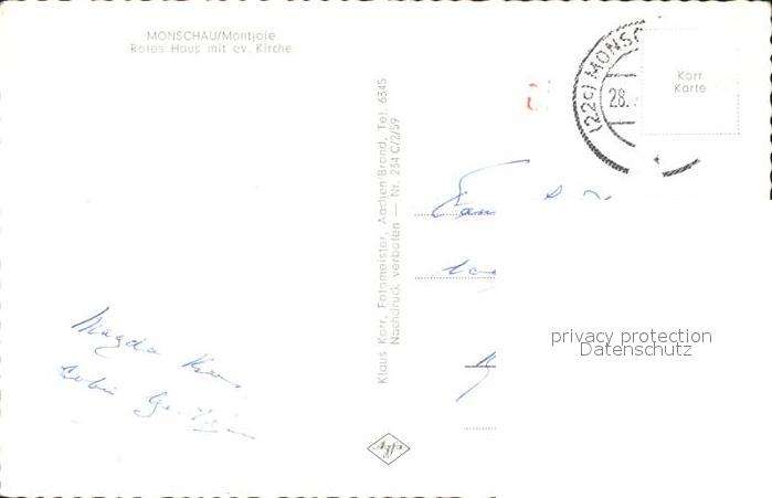 72105532 alte Postkarte Monschau Montjoie NRW Rotes Haus und ev Kirche postalisch gelaufen Erhaltung siehe scans KatCode: 11110005354020