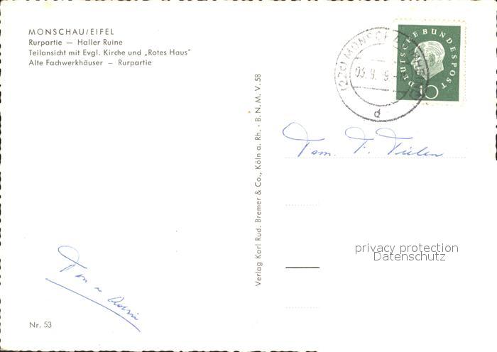 72378722 alte Postkarte Monschau Montjoie NRW Ruhrpartie Haller Ruine Evangelische Kirche Rotes Haus postalisch gelaufen Erhaltung siehe scans KatCode: 11110005354020