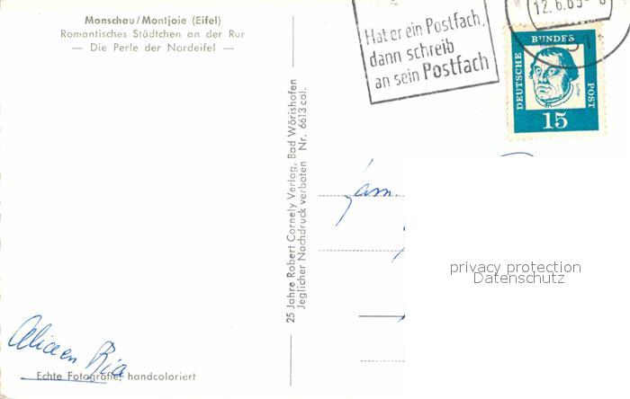 72762843 alte Postkarte Monschau Montjoie NRW Ruine Haller Teilansicht Gesamtansicht postalisch gelaufen Erhaltung siehe scans [AndreD76] KatCode: 11110005354020