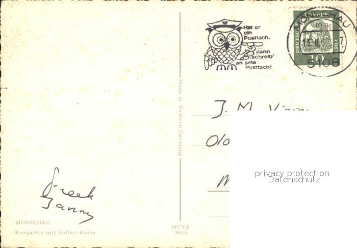 72310189 alte Postkarte Monschau Montjoie NRW Rurpartie Haller-Ruine postalisch gelaufen Erhaltung siehe scans KatCode: 11110005354020