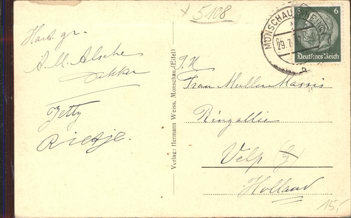 41493486 Monschau Montjoie NRW Rurpartie mit ev Kirche und Rotem Haus postalisch gelaufen Erhaltung siehe scans Alte Ansichtskarte Postkarte alte Postkarte hz_W Katcode 11110005354020