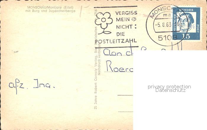 72076027 alte Postkarte Monschau Montjoie NRW Stadtbild mit Burg und Jugendherberge postalisch gelaufen Erhaltung siehe scans KatCode: 11110005354020