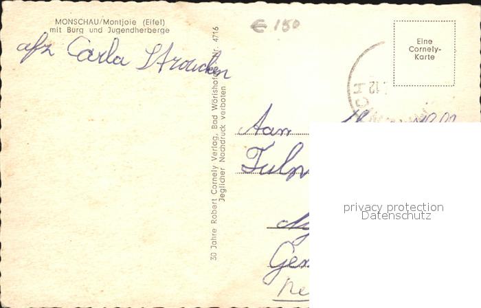 72477686 alte Postkarte Monschau Montjoie NRW Stadtbild mit Burg und Jugendherberge postalisch gelaufen Erhaltung siehe scans KatCode: 11110005354020