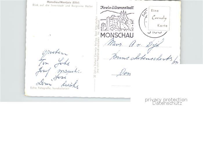 72538571 alte Postkarte Monschau Montjoie NRW Stadtblick mit Burgruine Haller postalisch gelaufen Erhaltung siehe scans [WerneD78 kt117box] KatCode: 11110005354020