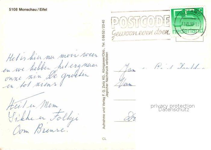 72860255 alte Postkarte Monschau Montjoie NRW Teilansicht postalisch gelaufen Erhaltung siehe scans [AndreD76] KatCode: 11110005354020