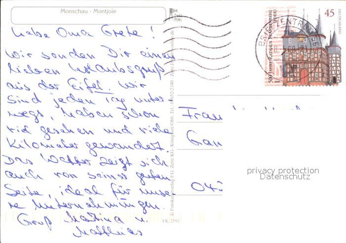 72533570 alte Postkarte Monschau Montjoie NRW Teilansicht Bruecke Rotes Haus Rurpartie Fachwerkhaeuser postalisch gelaufen Erhaltung siehe scans [WerneD78 kt116box] KatCode: 11110005354020