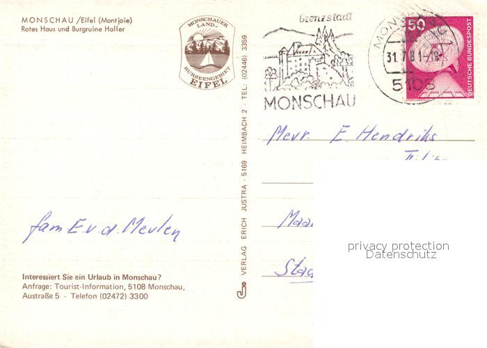 73132251 alte Postkarte Monschau Rotes Haus Burgruine Haller postalisch gelaufen Erhaltung siehe scans [KathaD81] KatCode: 11110005354020