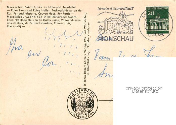 72926971 alte Postkarte Monschau Rotes Haus Ruine Haller Fachwerkhaeuser Perlbachtalsperre postalisch gelaufen Erhaltung siehe scans [NatalD47] KatCode: 11110005354020