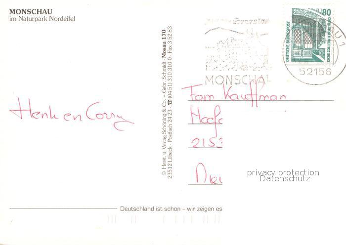 72935720 alte Postkarte Monschau Teilansichten Rotes Haus Fachwerkhaeuser Partie an der Rur Burg Schmetterling postalisch gelaufen Erhaltung siehe scans [FriedD77] KatCode: 11110005354020
