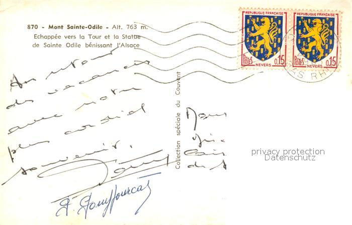 13608201 carte postale Mont-Sainte-Odile Mont-Ste-Odile Echappée vers la Tour et la Statue de Sainte Odile bénissant l’Alsace postalisch gelaufen Erhaltung siehe scans [FriedD77] KatCode: 11170067567397