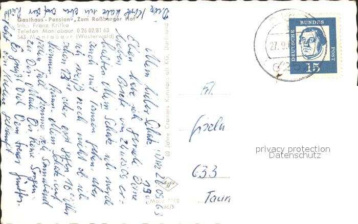 72098254 alte Postkarte Montabaur Westerwald Gasthaus Pension zum Rossberger Hof postalisch gelaufen Erhaltung siehe scans KatCode: 11110007143048